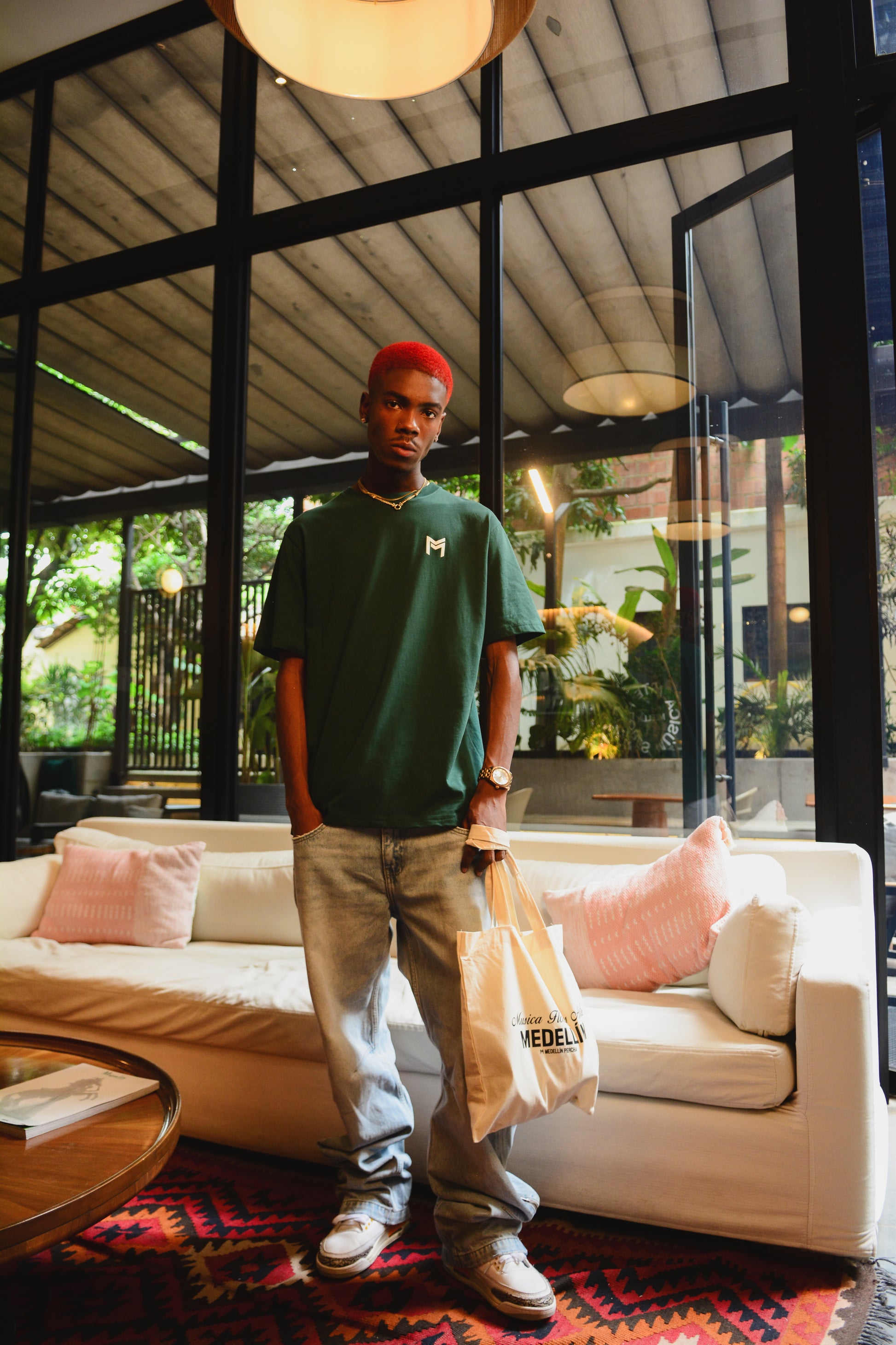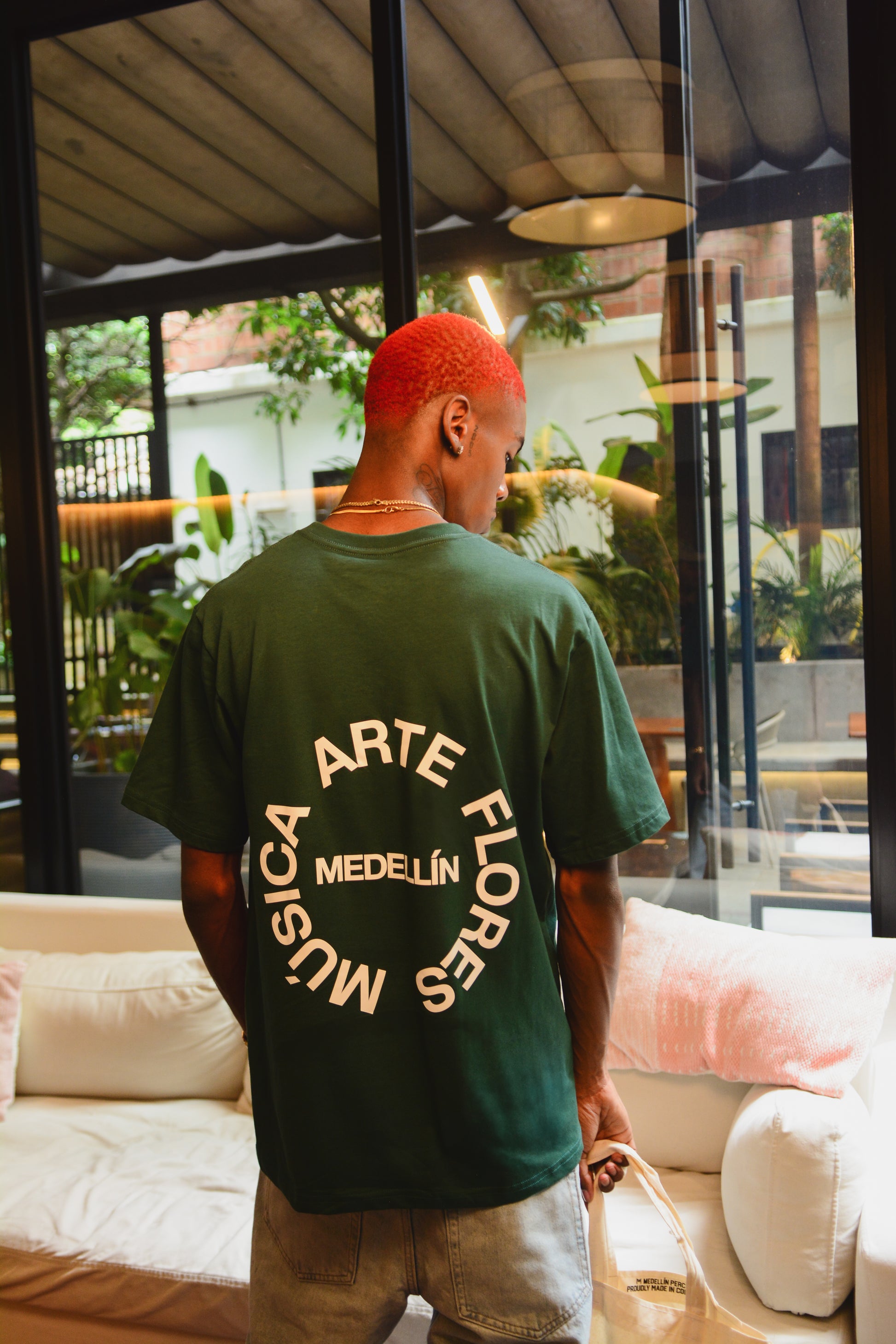 Camiseta unisex en 100% algodón colombiano de 220 gramos, en color verde oscuro. En la parte trasera lleva un diseño gráfico con las palabras “Música”, “Arte”, “Flores” y “Medellín” dispuestas en un círculo, resaltando elementos representativos de la ciudad. Ideal para un estilo casual y cómodo, con un tejido suave y resistente.